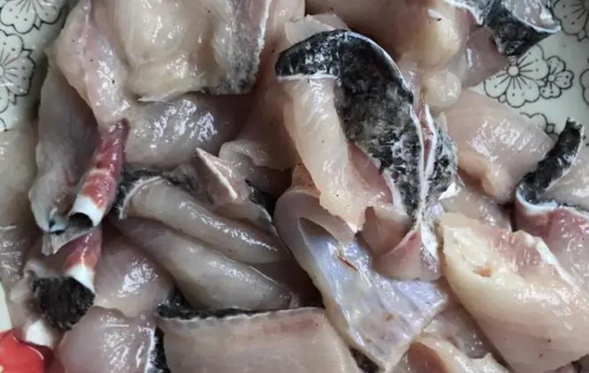 1、準備一條黑魚,將其魚鱗、內臟這些都去除以後,把魚頭、魚尾巴切下來,再沿着中間的魚骨,將兩片大魚片切下來。