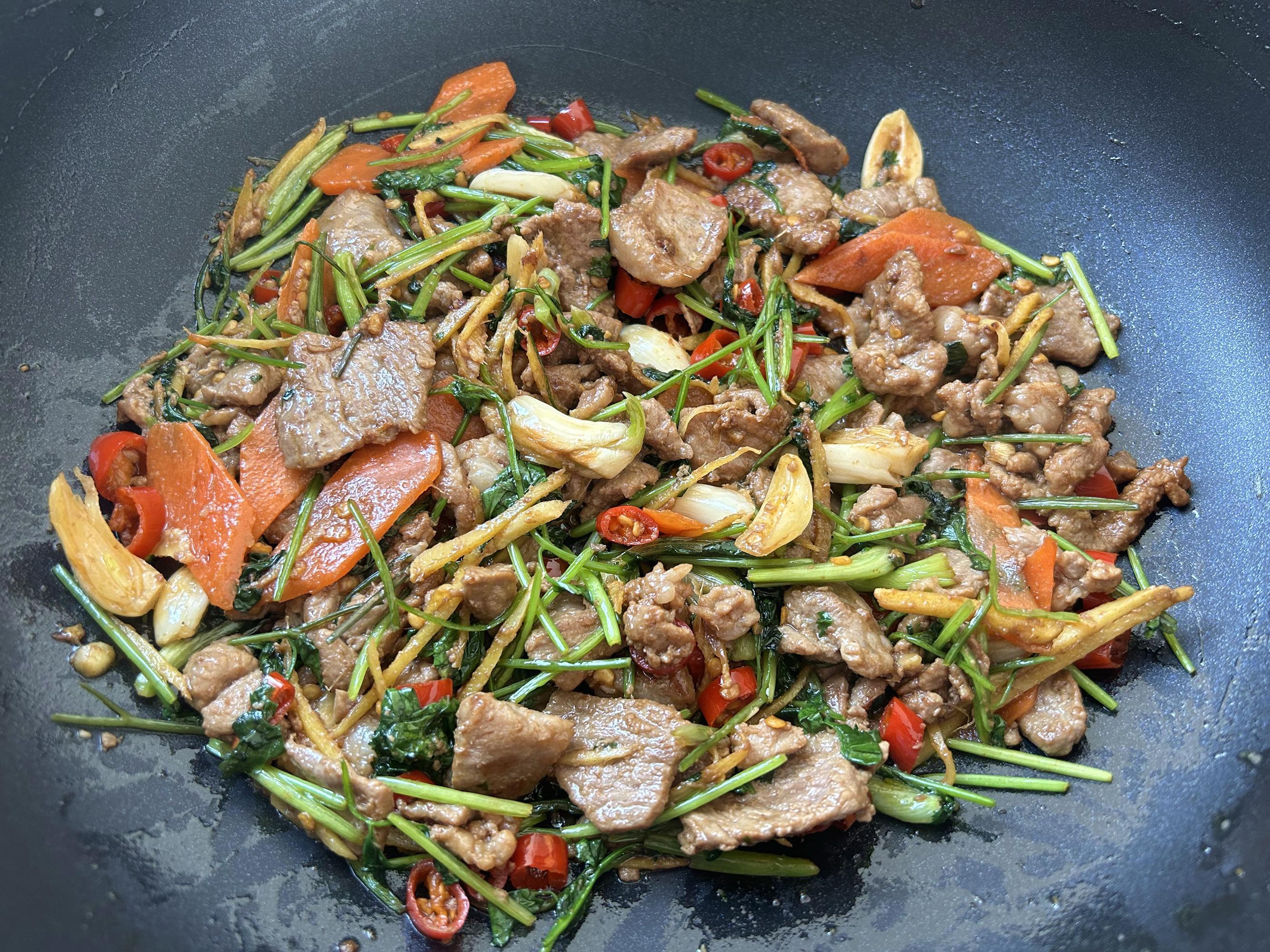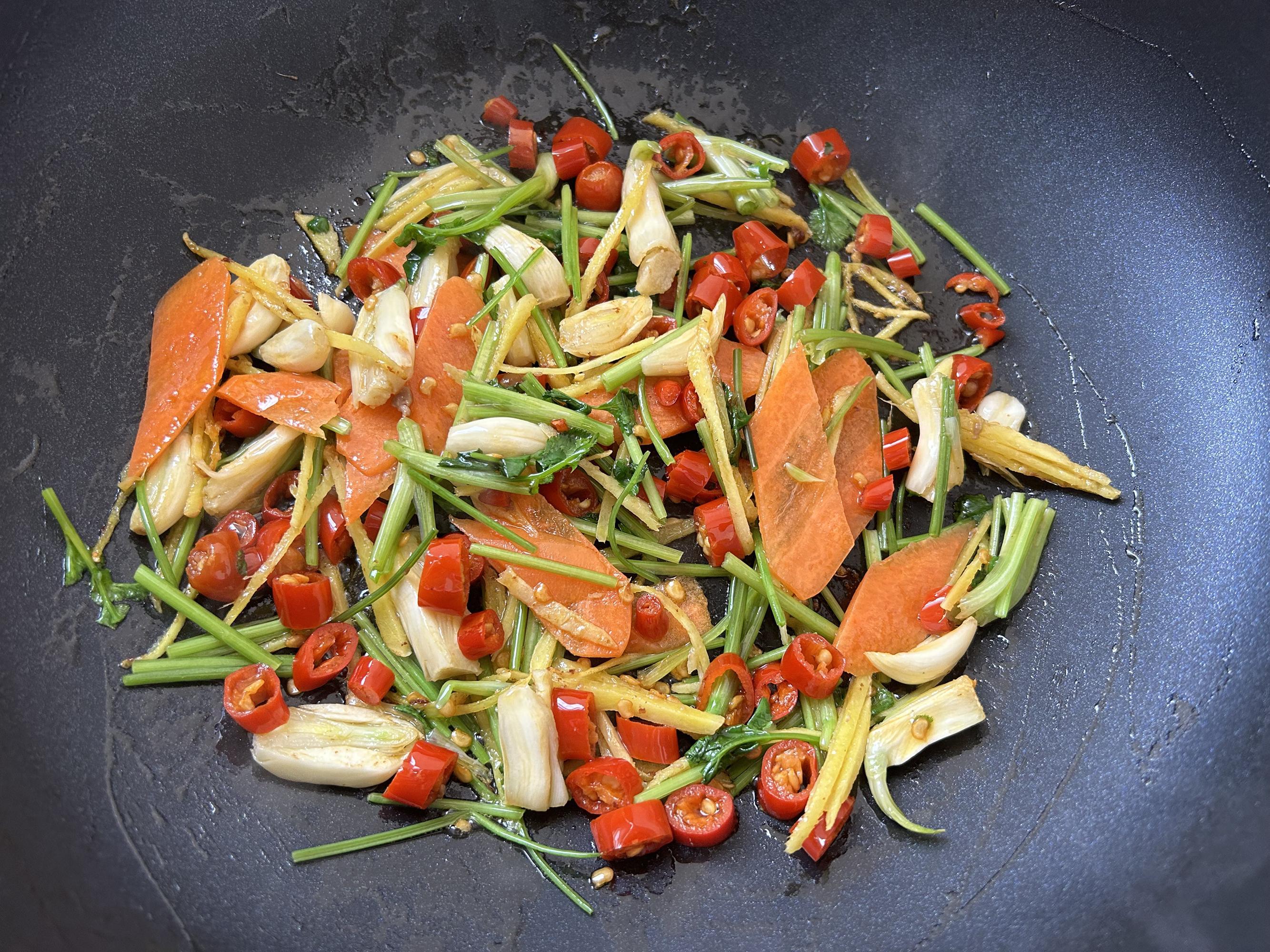 鍋裏重新放油,放入姜蒜和紅泡椒熗鍋,翻炒出香味,加入胡蘿蔔和香菜不帶葉子的部分,翻炒到斷生。