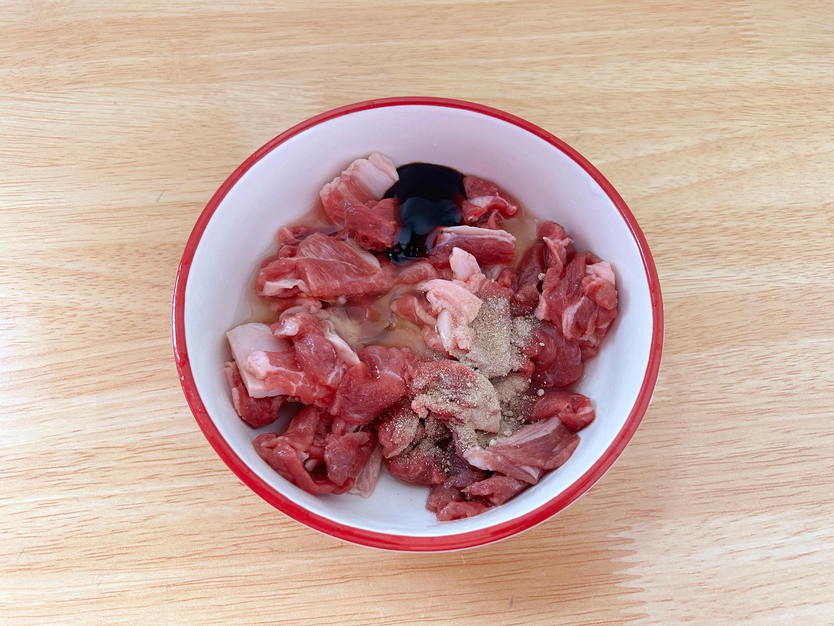 羊肉放入碗裏,加入料酒、白胡椒粉、蠔油和雞蛋清混合均勻。醃製羊肉,加白胡椒粉可以去掉一部分羶味。
