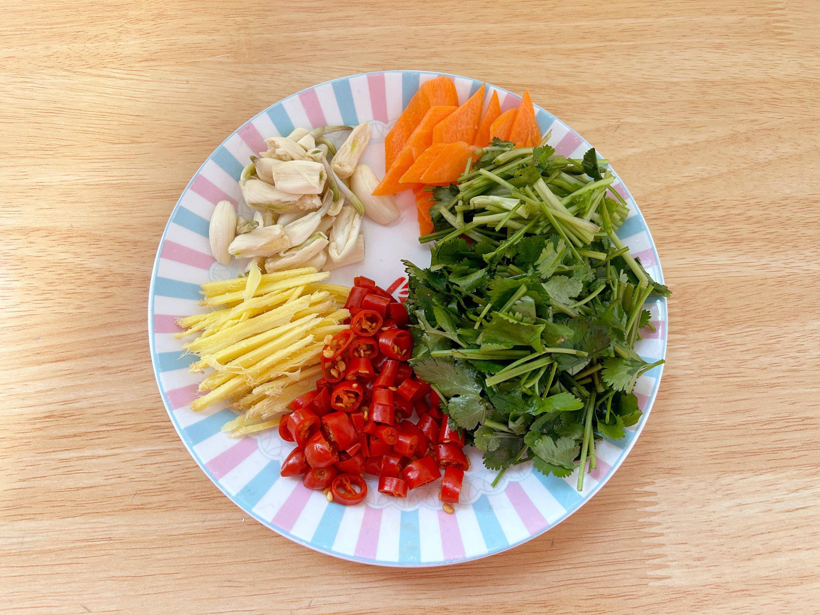生薑去皮切絲、大蒜拍扁去皮,紅泡椒切圓圈,胡蘿蔔去皮切薄片,香菜去根切成長段。如果用酸的子姜代替生薑,味道會更好。