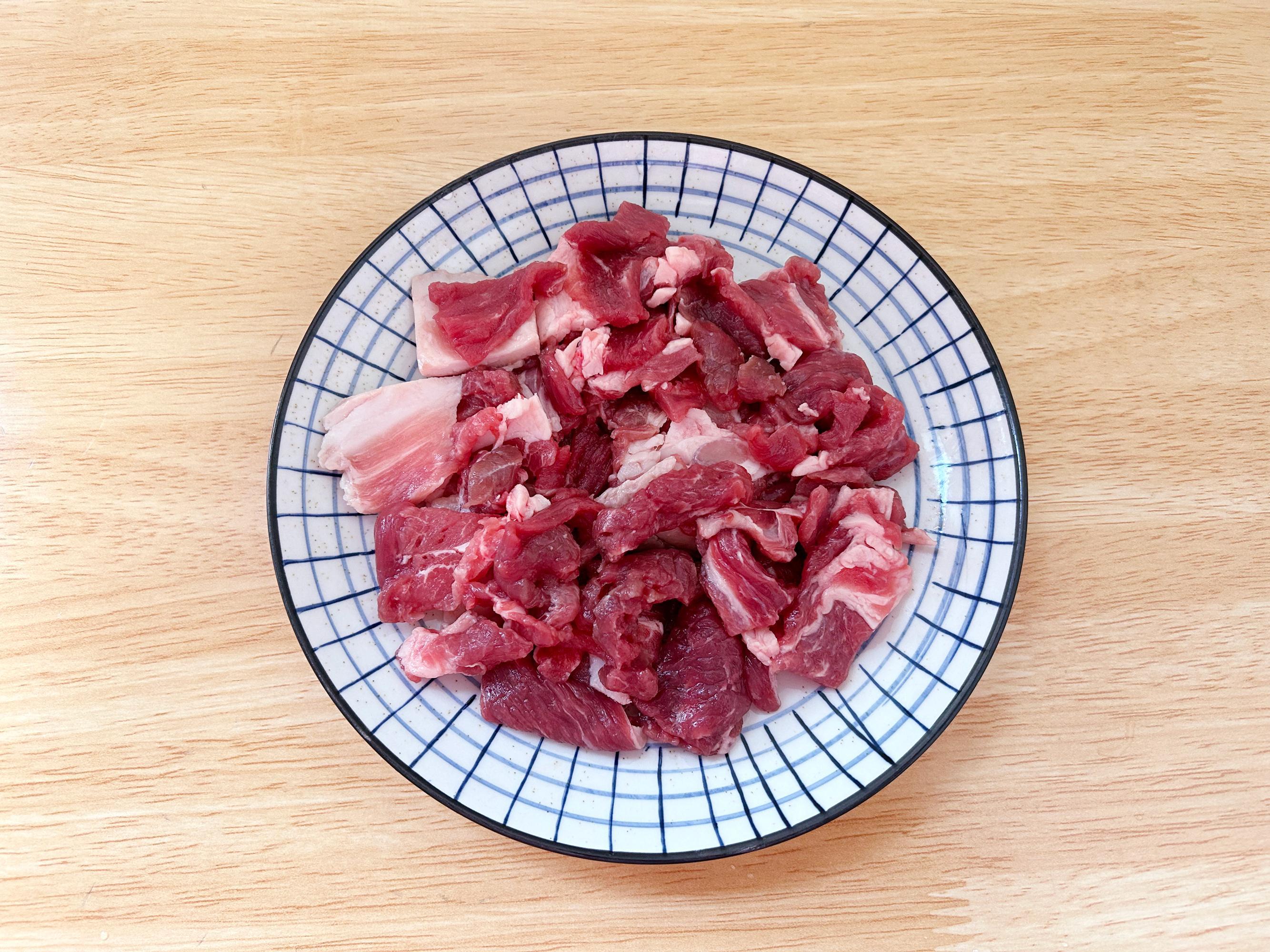 羊肉切成薄片,建議買新疆的羊肉,基本上沒有羶味。如果是買本地羊肉,最好買綿羊肉,羶味小,味道更鮮美。