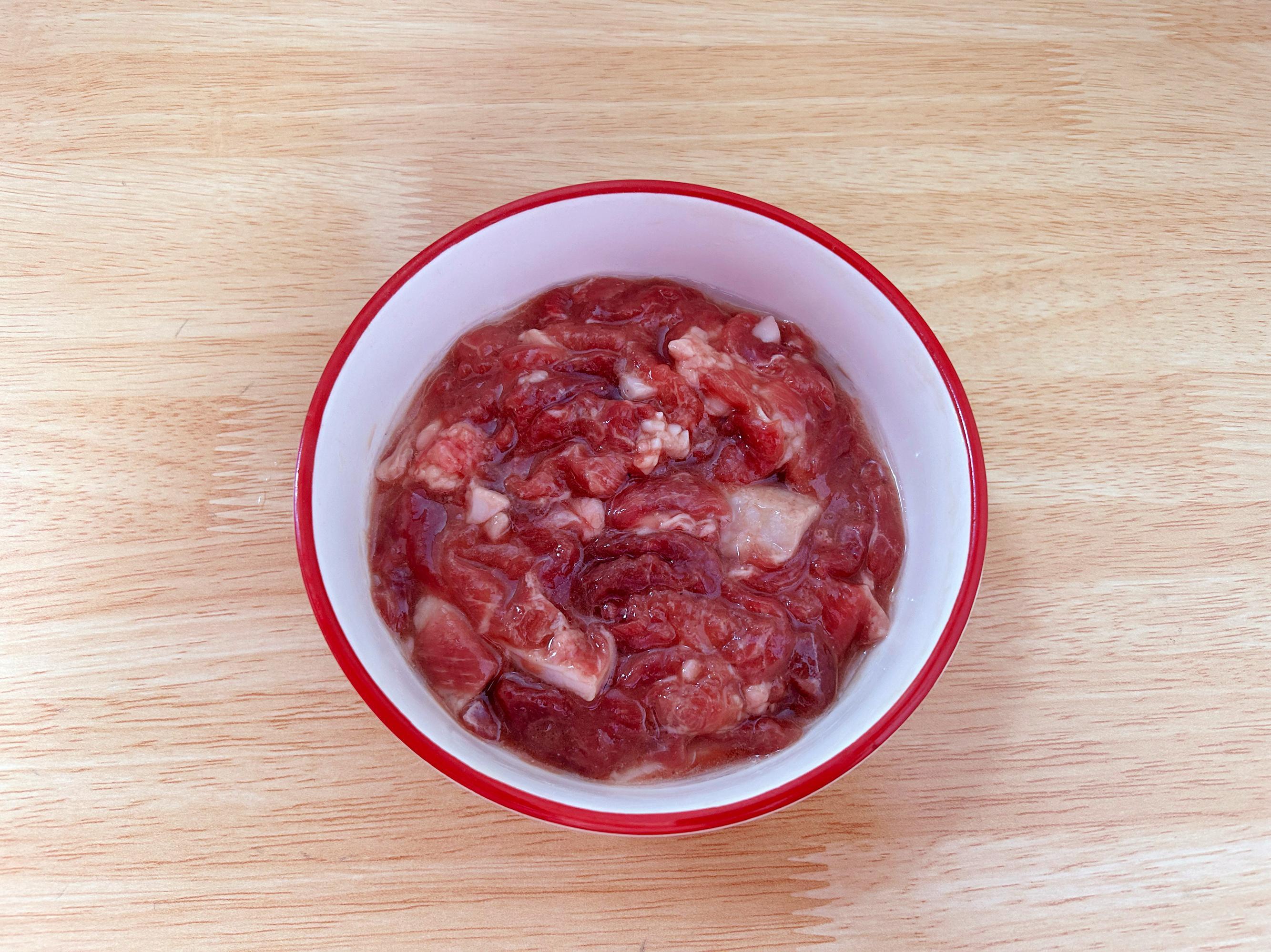 1勺玉米澱粉加2勺水混合均勻,倒入羊肉中,抓到羊肉吸收掉水澱粉,加1勺油混合均勻,鎖住羊肉中的水分。