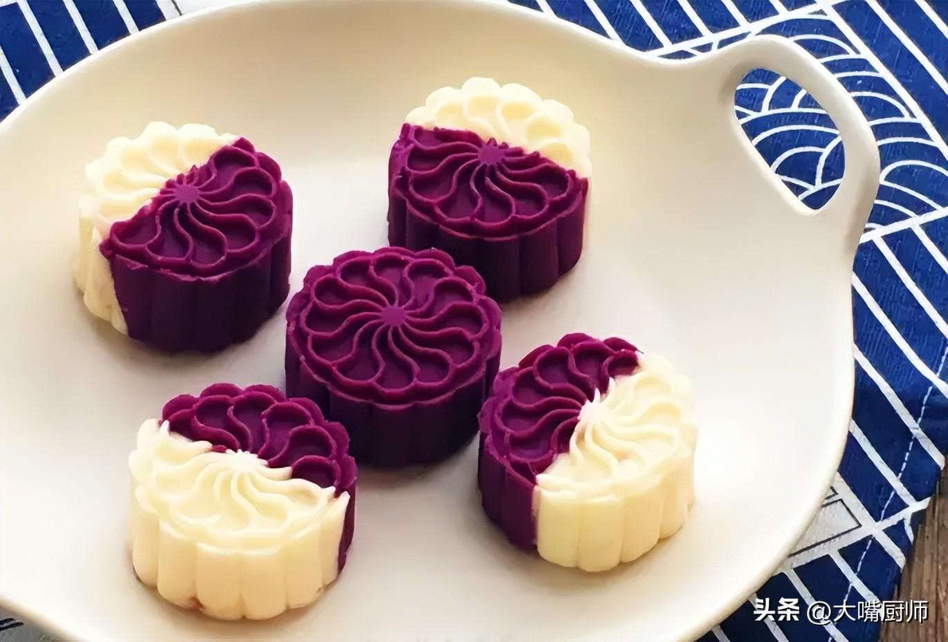 3、把紫薯泥、山藥泥分成小份,搓成小圓球。準備一個月餅模具,把紫薯球、山藥球塞進去,扣在盤子裏壓成型,淋上桂花蜜即可食用。