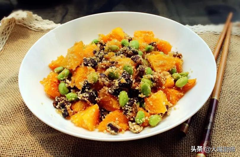 2、把南瓜、青豆、幹香菇放入大碗中,倒入米粉,再加入食鹽、生抽、白糖、食用油,用手抓拌均勻,讓南瓜裹滿米粉。蒸鍋加水燒開,放入南瓜蒸20分鐘,即可出鍋。