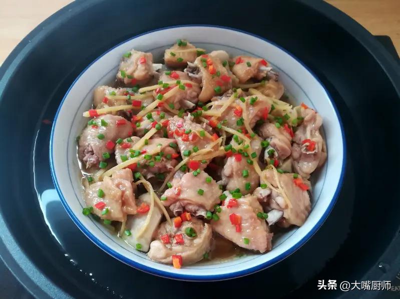 3、蒸鍋加水燒開,放入雞翅芋頭,蓋上蓋子蒸20分鐘,出鍋撒上蔥花、小米椒,鍋裏燒熱油,潑在上面熗出香味,即可食用。