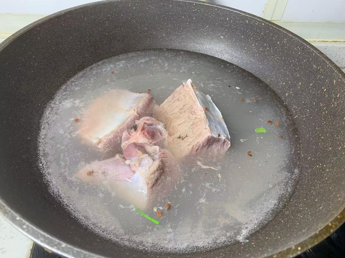 3、牛肉醃好後,用筷子挑出裏面的蔥姜、花椒粒,放入冷水鍋中,大火把牛肉煮一下,煮的同時用筷子往牛肉上插幾下,能更好的煮出裏面的血水。