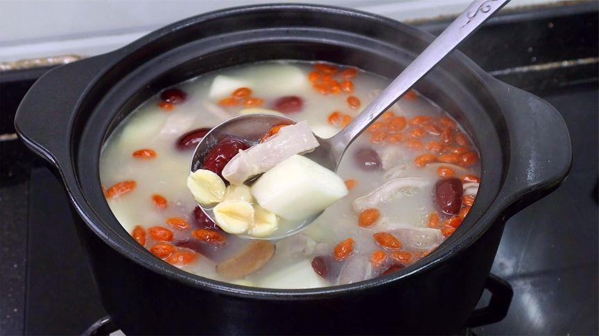 2、把山藥,紅棗一起加進去,繼續煲25分鐘。把枸杞加進去,調入少許的胡椒粉,鹽,山藥蓮子豬肚湯就煲好了。