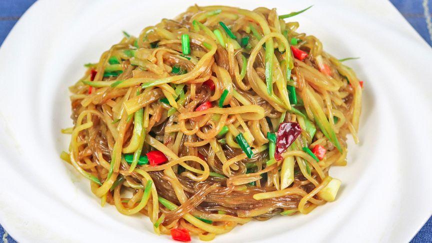 2、油溫五成熱時,加入豬油倒入蔥、姜和紅幹椒爆香。再倒入蘿蔔絲,快速翻炒片克,加入老抽幾滴調色,翻炒均勻,淋入翻勺清水,調味加入食鹽,雞粉,十三香,粉條,快速翻炒幾下,倒入蒜苗和紅椒翻炒即可。