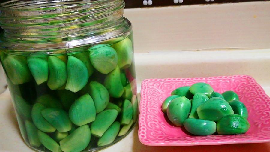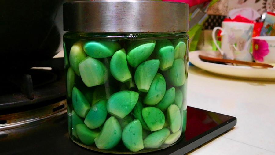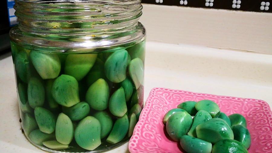 保存:臘八蒜醃製的時候需要的溫度是冷熱交替,白天的時候將瓶子放到溫暖陽光能照到的地方,晚上再把它拿回溫度較低的廚房保存,這樣在一熱一冷的交替作用下,大蒜一般兩三天就會開始變綠了,一個周7天左右就會完全變綠。