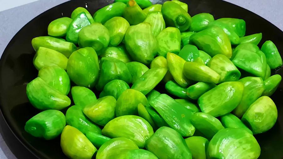 切蒜:這一步是臘八蒜能充分變綠的關鍵所在,去皮的蒜瓣切掉頭尾,目的是增加大蒜與醋的接觸面積,從而喚醒休眠期的大蒜,催生出化學物質,使大蒜快速變綠。