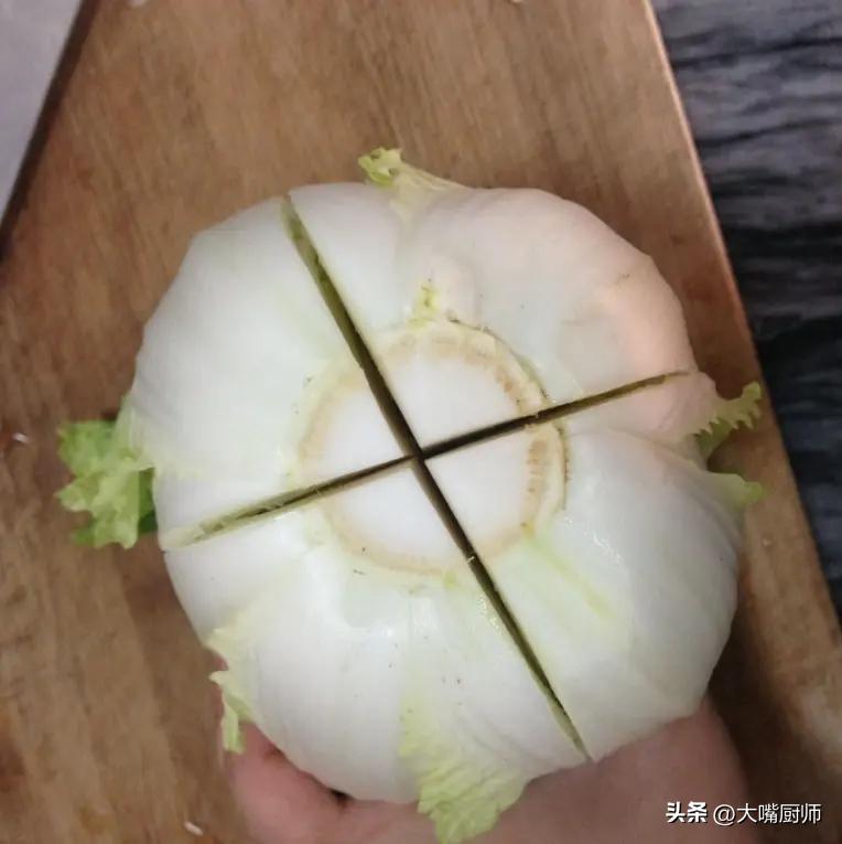 3、把白菜外層的葉子扒掉,裏面就很乾淨了,不要清洗,沾生水後容易腐爛變質。用乾淨的菜刀把白菜一劈四半,切開的白菜更容易醃透,口感更爽脆。