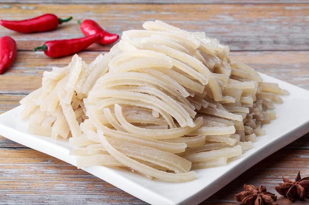 4、然後再放到水中,多衝洗2遍,就可以切成細絲狀了。焯水後,記得用刮刀把豬皮上面的油脂刮下來,這樣做出來的豬皮凍,纔是晶瑩剔透的,並且也沒什麼腥味,這就是“多做1步”。