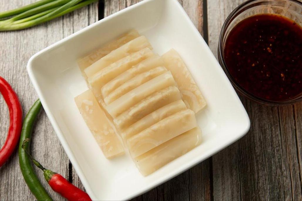 6、關火以後,將裏面多餘的蔥姜挑出來,然後找一個盒子,把豬皮和湯汁一起倒在裏面,將盒子蓋好以後,放入冰箱內靜置一會兒,待其冷卻後,就凝固成豬皮凍啦。倒扣過來,取出來切塊,擺在盤子裏,用蒜末、醬油、米醋、香油、辣椒油做個料汁,蘸着喫。