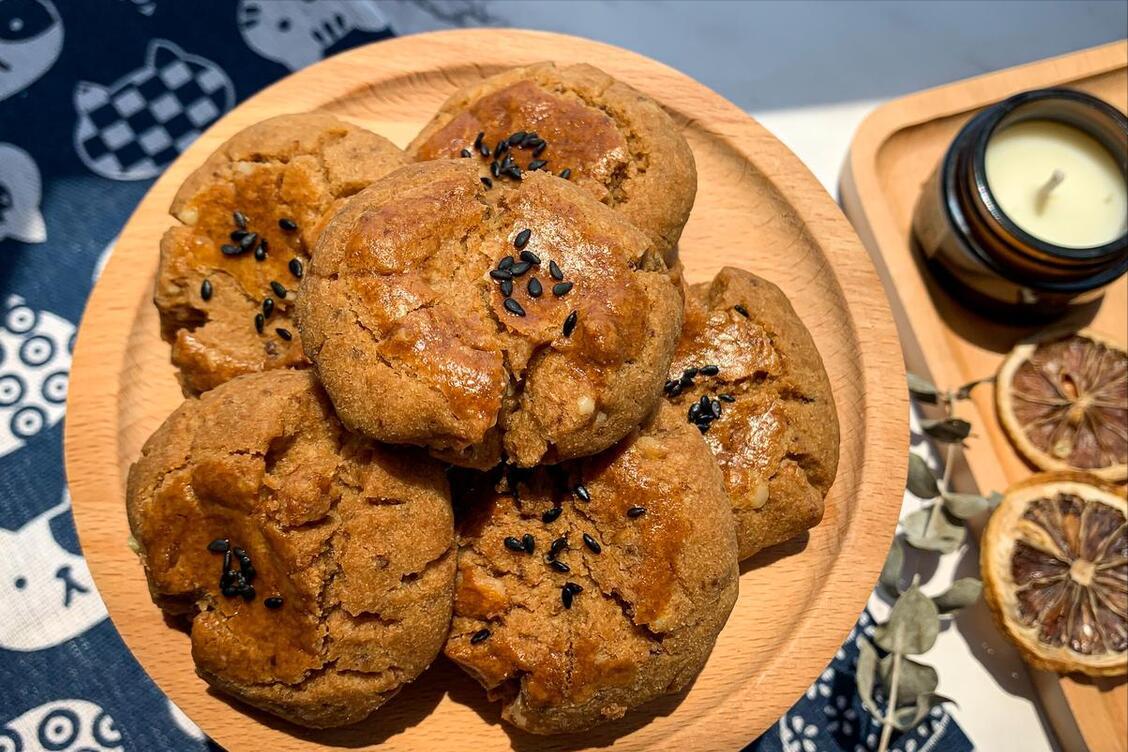 2、下面充分攪拌成麪糰,然後分成數個劑子,每一個劑子揉圓按扁,中間用大拇指戳一下。烤盤中墊上油紙,擺放上去,然後在上面,刷上一層蛋液,撒上黑芝麻。放入烤箱,150度烤30分鐘左右,烤好後晾涼開喫,非常酥脆,還有核桃的香氣。