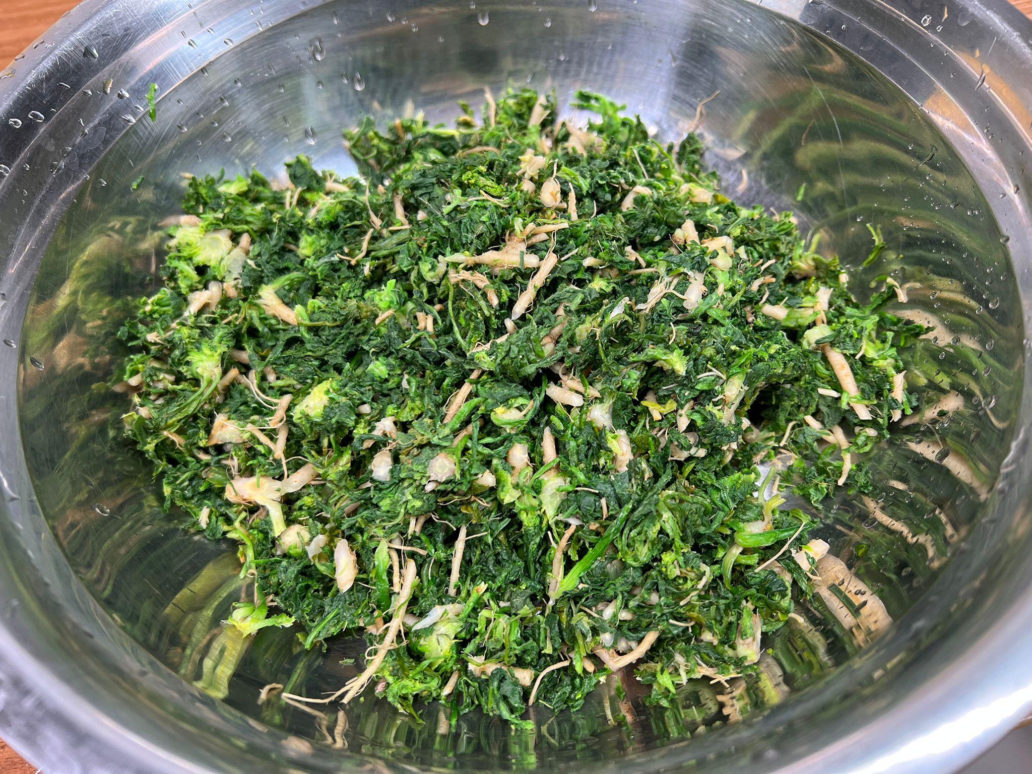 將洗淨的薺菜切碎,加入麪糰中。薺菜富含營養,不僅爲餅增色添香,更爲身體提供了額外的維生素。 將薺菜與麪糰充分揉勻,使薺菜均勻分佈在麪糰中。然後將揉好的麪糰搓成小餅狀,可根據個人口味大小適量。