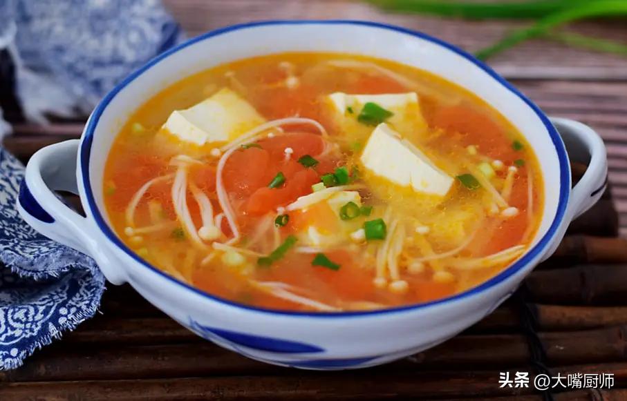 1、番茄洗乾淨,碗里加入適量開水,放入番茄燙2分鐘,撈出撕掉外皮,洗乾淨備用。金針菇切掉老根,撕成細條,洗乾淨備用。豆腐洗乾淨,切成小塊,蒜瓣去皮切末。
