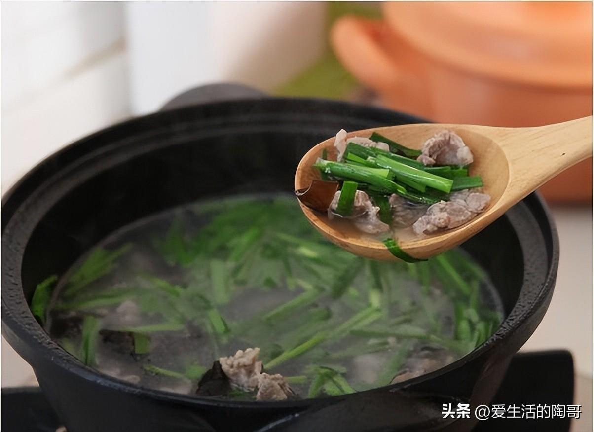 推薦喫法,韭菜羊肉湯。羊肉是冬季的滋補肉,肉質細嫩,營養高,既能御風寒,又可補身體。兩者一起煮湯喝,味道鮮美,喝上一碗熱騰騰的韭菜羊肉湯,讓身體從內到外都暖洋洋的。