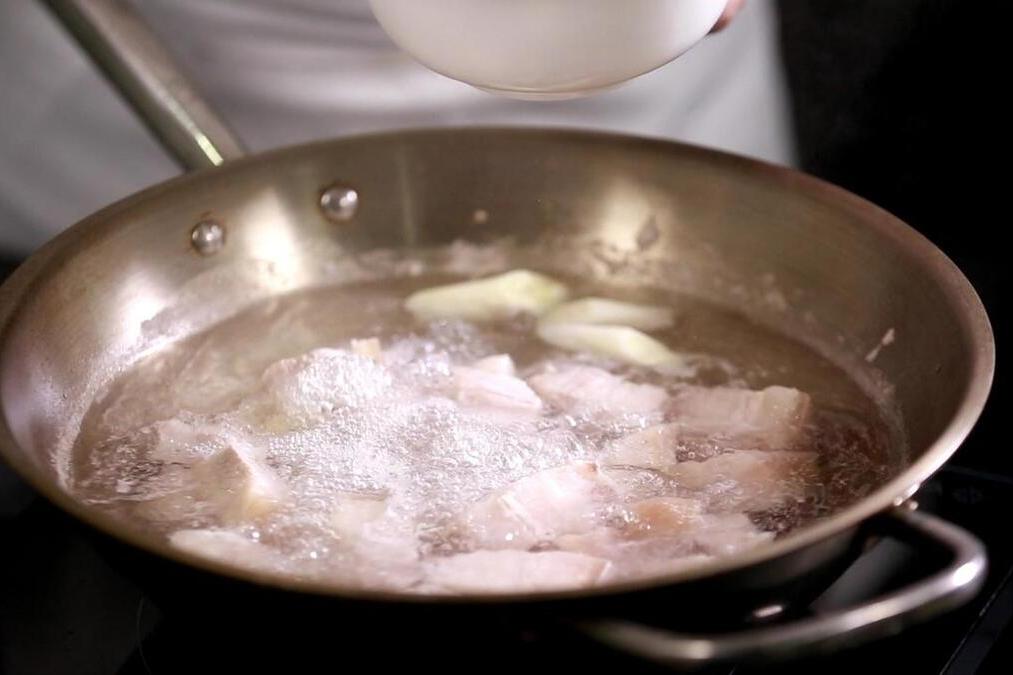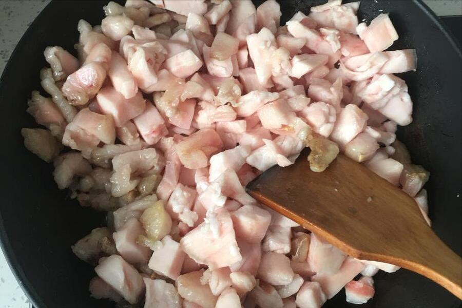 4、大火先燒上一會兒,片刻功夫裏面的水就被燒乾了,水燒乾以後,接下來就是豬板油出油的時間了。沒有水分以後,我們就得拿上一把勺子,開始不停翻動了,才能保證豬板油出油更透徹。