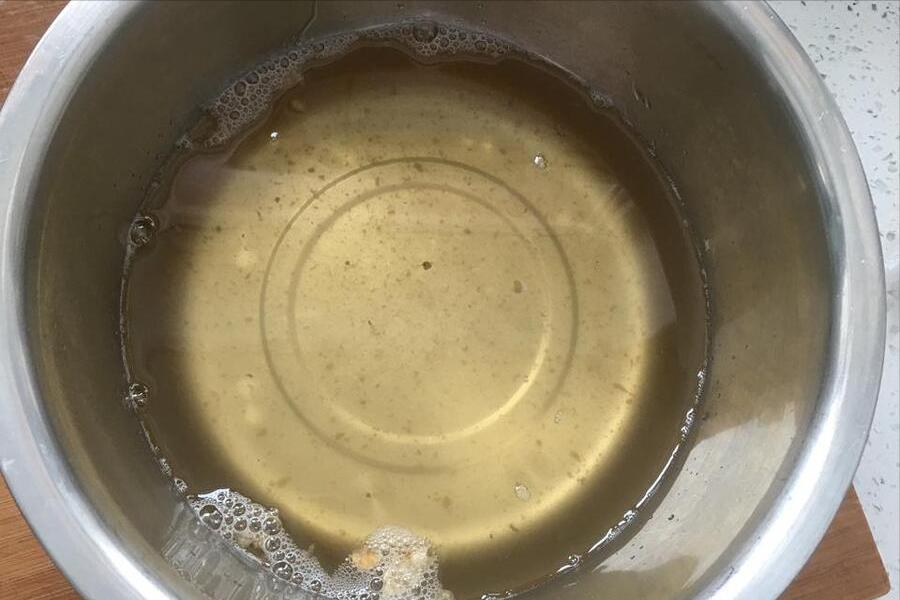 5、熬上一會兒,豬油的出油率越來越高了,裏面的油越來越多,豬板油的體積越來越小,而且顏色也越來越黃了。等豬板油,逐漸變成豬油渣,變得又黃又焦之後,就可以將其盛出來啦。
