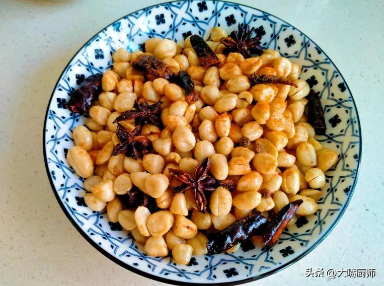 1、花生米洗乾淨,加水浸泡1個小時,用手搓掉花生米,用紙巾吸乾表面多餘的水分,放入碗中加入食鹽、花椒、八角、幹辣椒、食用油翻拌均勻,醃製半小時。