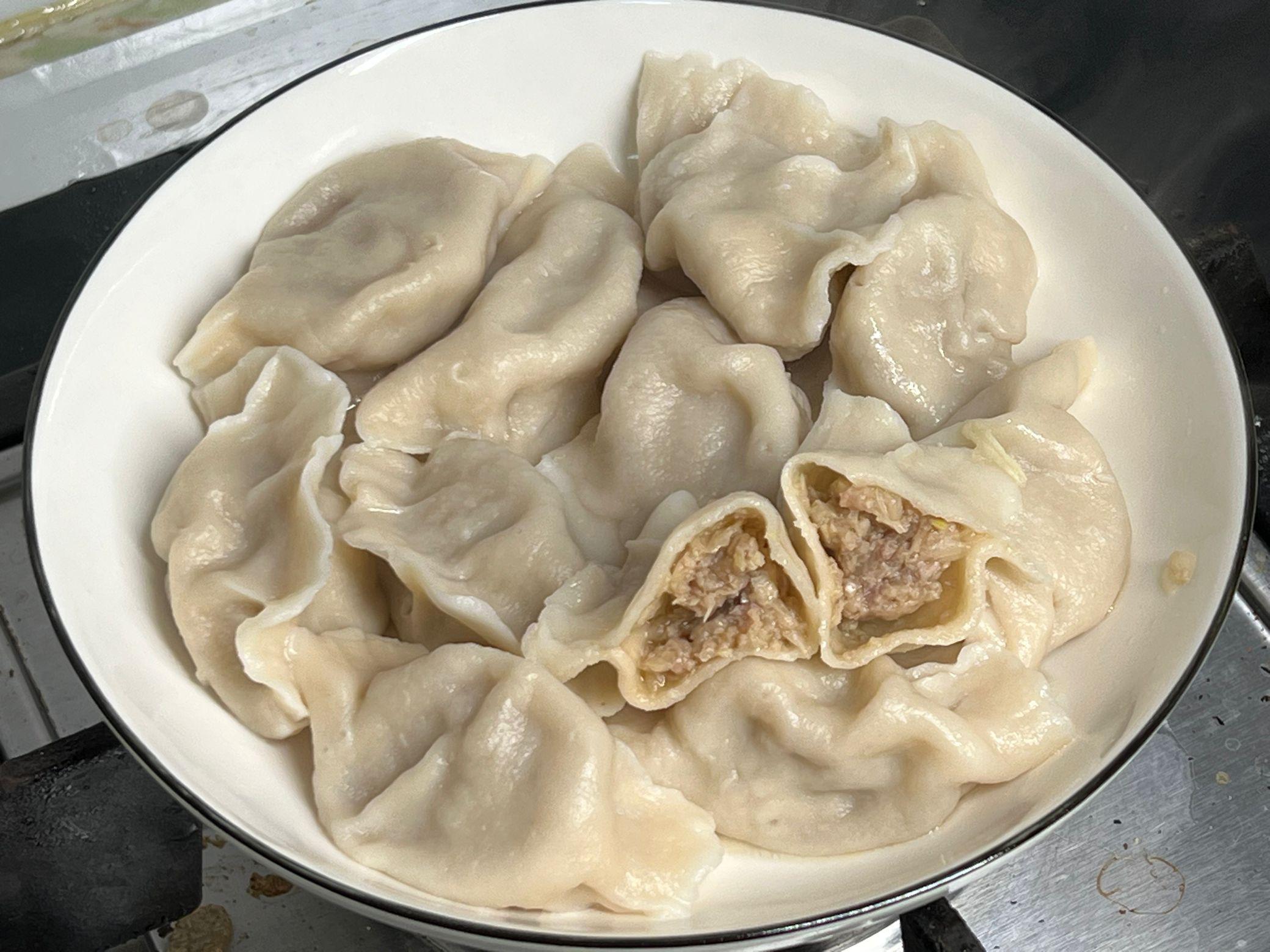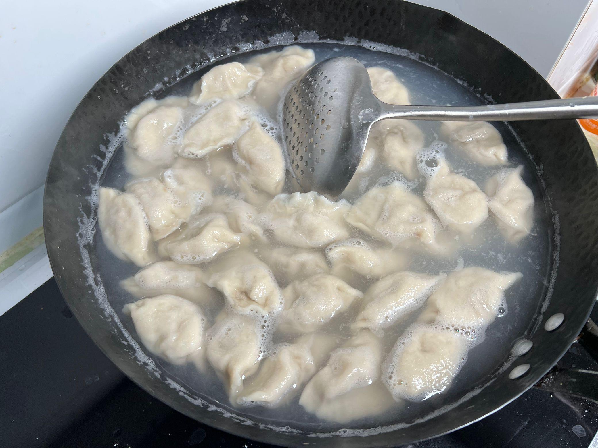 包餃子的過程中,燒一鍋熱水,將包好的餃子放入沸水中,煮至餃子浮起並水開後,再加入適量的冷水,重複此步驟,直至餃子煮熟。待餃子煮熟後,用漏網撈出,瀝乾水分。可以選擇直接食用,也可以將餃子煎至底部金黃,增添口感。