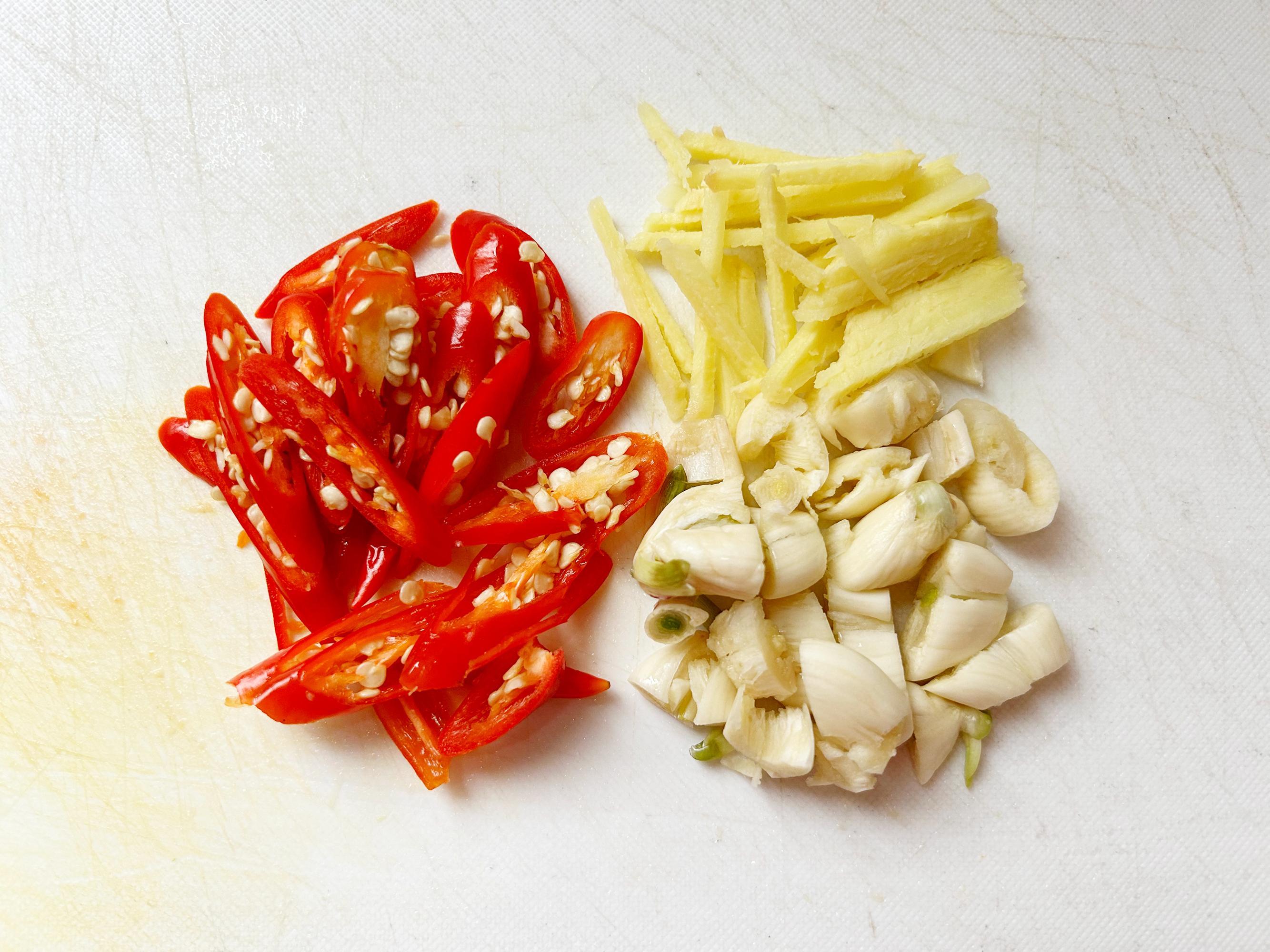 生薑去皮切絲,大蒜拍扁去皮切顆粒,小米椒斜着切成條。