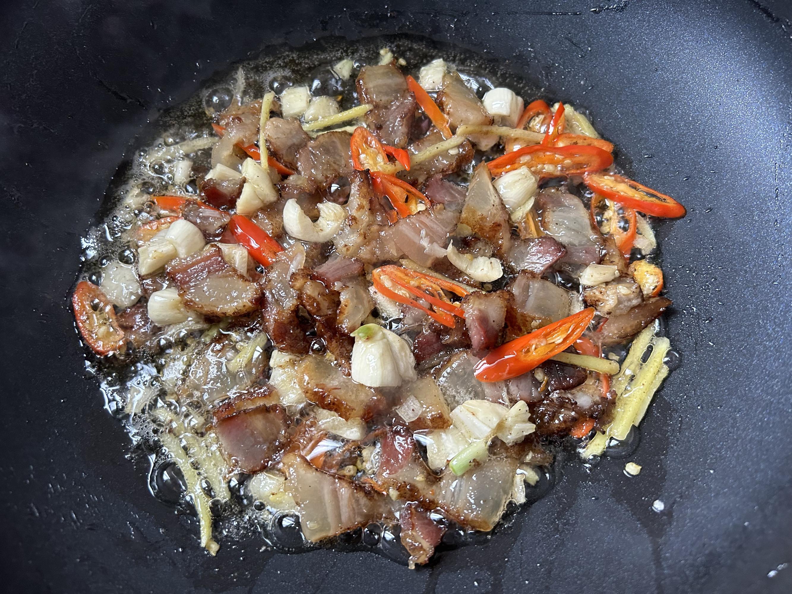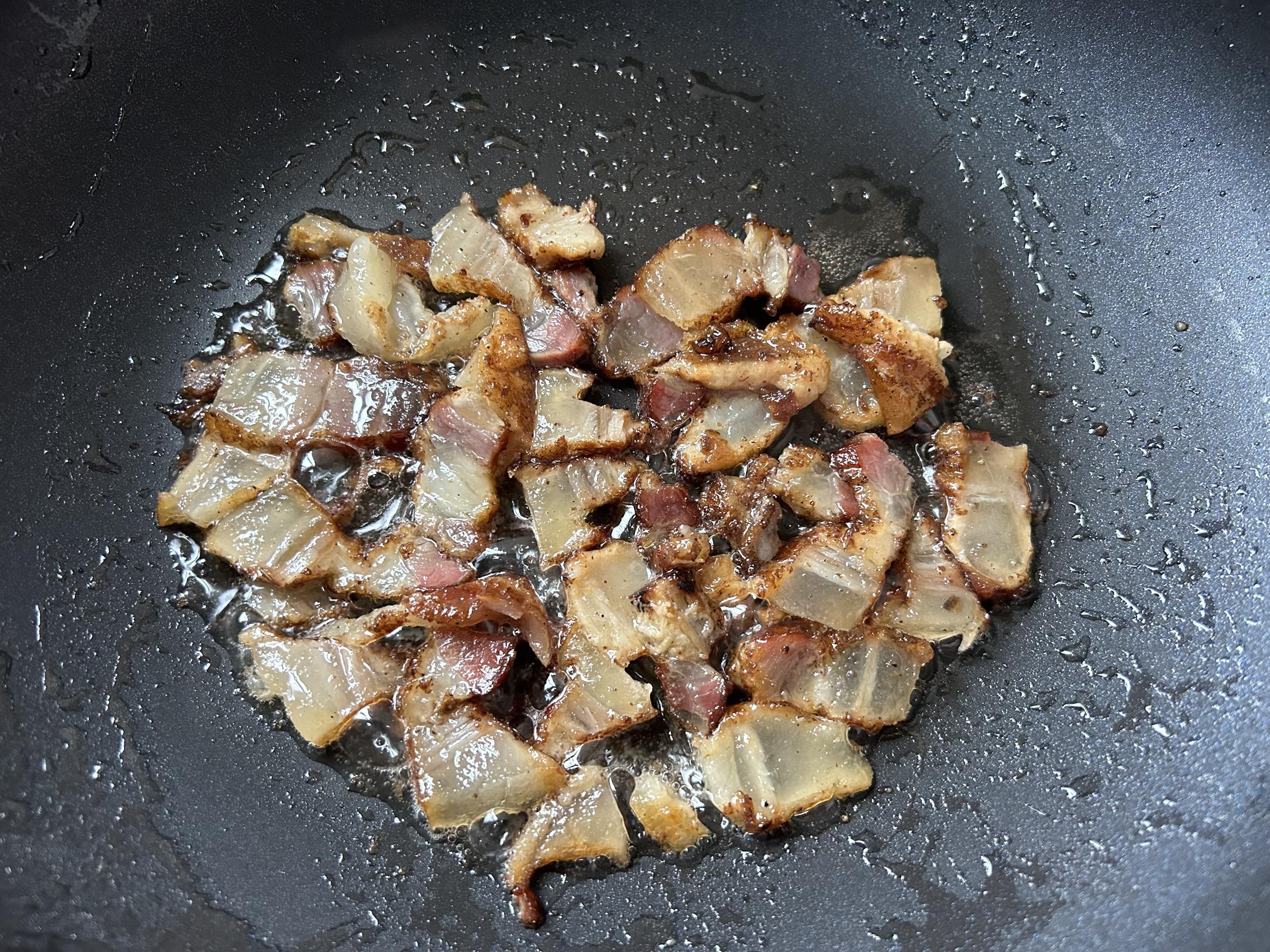 熱鍋後放一點油,放入肥的臘肉煎到微微出油,勤翻動,避免糊了。