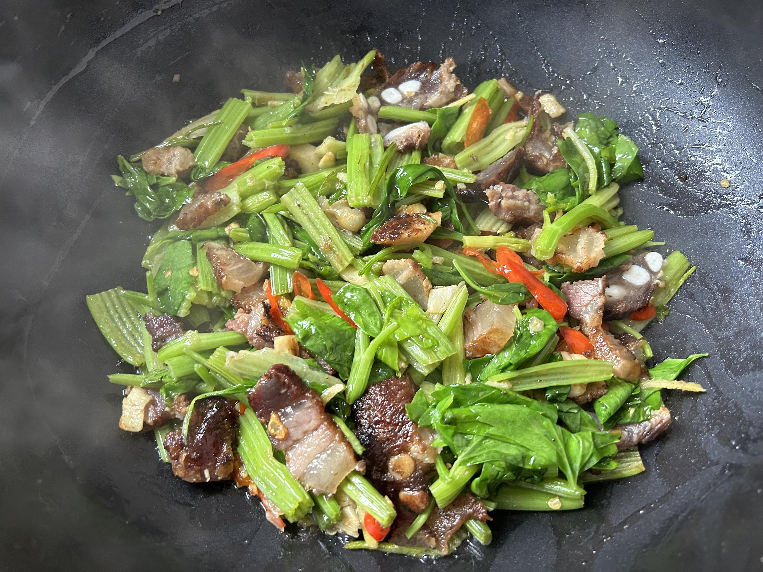 加入芹菜葉子,翻炒斷生,加適量的鹽調味,翻炒均勻,一道好喫又有營養芹菜炒臘肉就做好了。