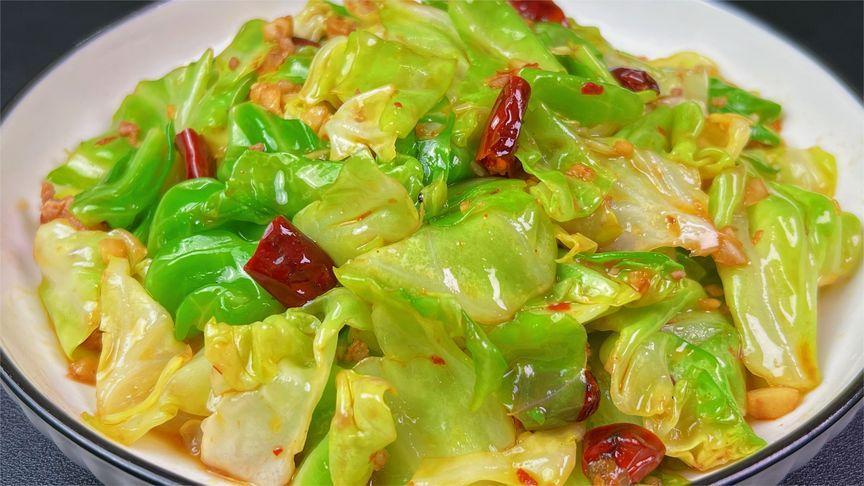 2、油溫燒熱,把包菜放入鍋中,炒至六七成熟了,可以出鍋了,再次起鍋放入豬油。把蒜末、幹辣椒爆香後,把肉末炒至變色。這會兒呢,加入香辣醬,調味料汁加進來了,火爆炒。