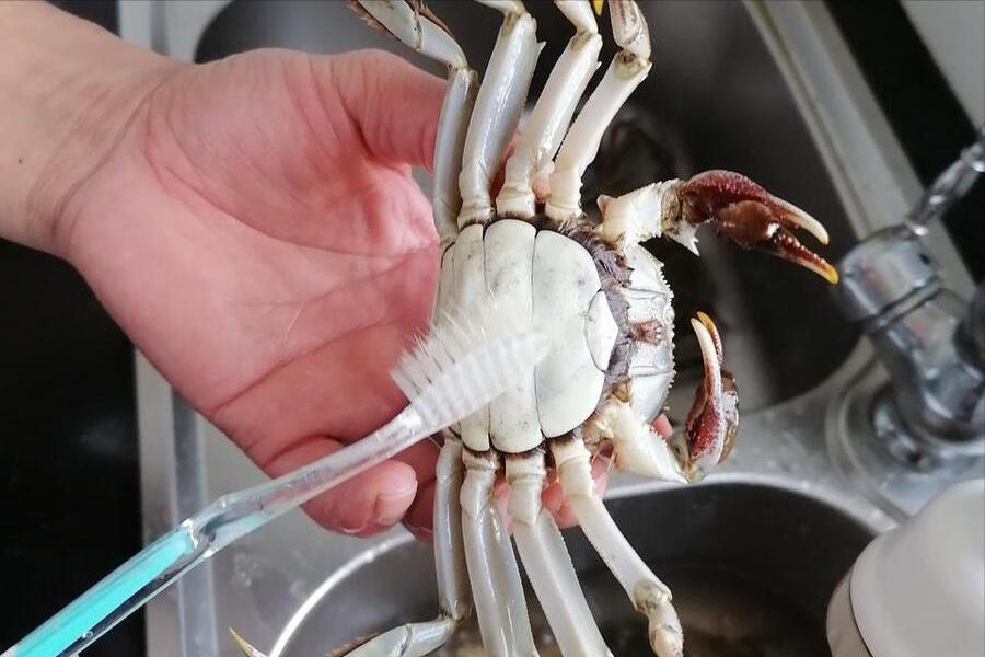 2、我們往螃蟹的嘴裏,用一根牙籤或者尖銳的東西刺一下,瞬間就不動彈了,清洗也好清洗,蒸的時候還不會掙扎,自然也不會掉腿了,這是第一個妙招。解開繩子,放在水中,用小刷子來刷洗。