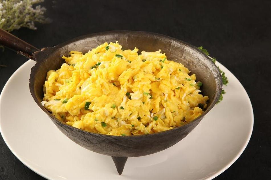 5、接下來把雞蛋打散,然後往鍋子裏倒油,倒進去把雞蛋炒一下,炒的時候用鏟子不停攪動,將其炒成小塊,盛出來。雞蛋一定要涼透了之後,纔可以來調餡兒,把韭菜、扇貝肉、雞蛋、木耳,都倒在一個盆裏。