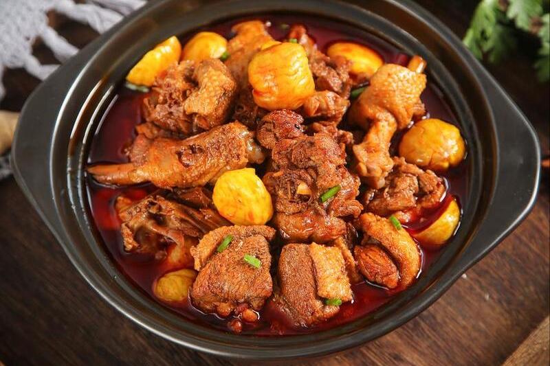 2、板栗剝皮,蔥姜切好,接下來起油鍋,把雞肉倒進去翻炒,炒到表面變色後,把蔥姜扔進去翻炒兩下,用生抽、老抽、蠔油、料酒調味,然後往裏面添水。把板栗也倒進去,大火燒開後,小火燉40分鐘左右,最後加上鹽、胡椒粉、雞精調味,攪拌均勻出鍋。