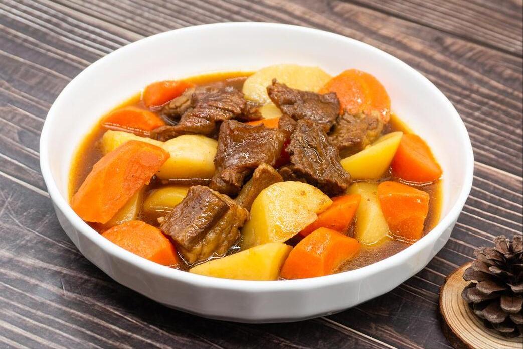 2、之後加上牛肉翻炒,炒到上色後,倒入蔥姜、大料、香葉、桂皮炒香,接着用生抽、老抽、蠔油調味,緊接着往裏面添上適量的開水,蓋上蓋子燉。大火燒開,小火燉40分鐘,然後放上土豆、胡蘿蔔,再燉20分鐘後,用鹽調味,攪拌均勻後即可出鍋。