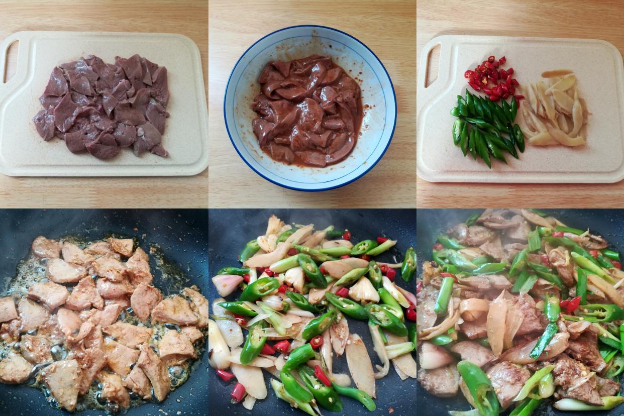 3.熱鍋放油,放入羊肝翻炒到熟透盛出來,鍋裏重新放油,放入酸姜、泡椒和青椒翻炒出香味,加入炒熟的羊肝翻炒均勻,加鹽調味。