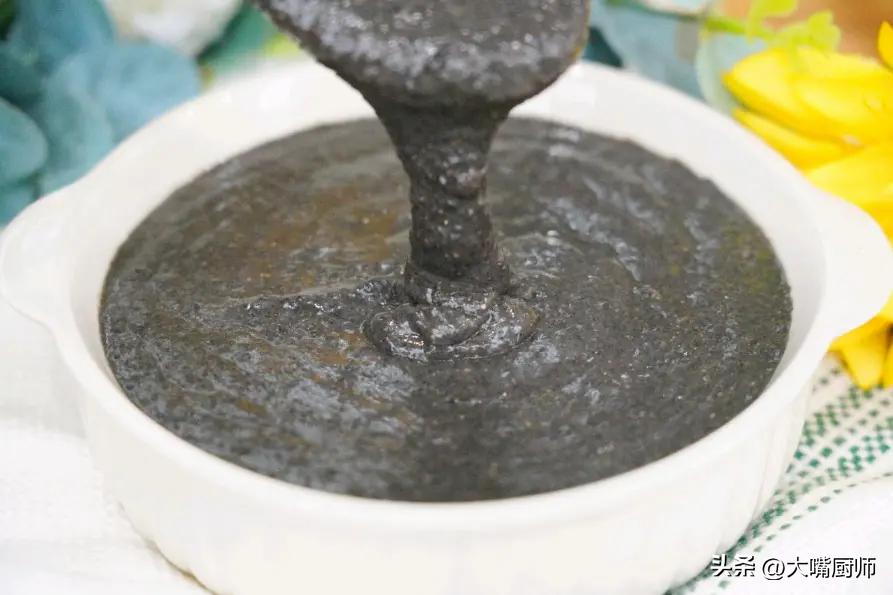3、把黑芝麻粉和糯米粉混合在一起,比例約是7:1。舀一勺黑芝麻糊放入碗中,加入適量白糖,倒入剛燒開的水,用勺子攪拌均勻,變成細膩濃稠的糊狀即可食用。