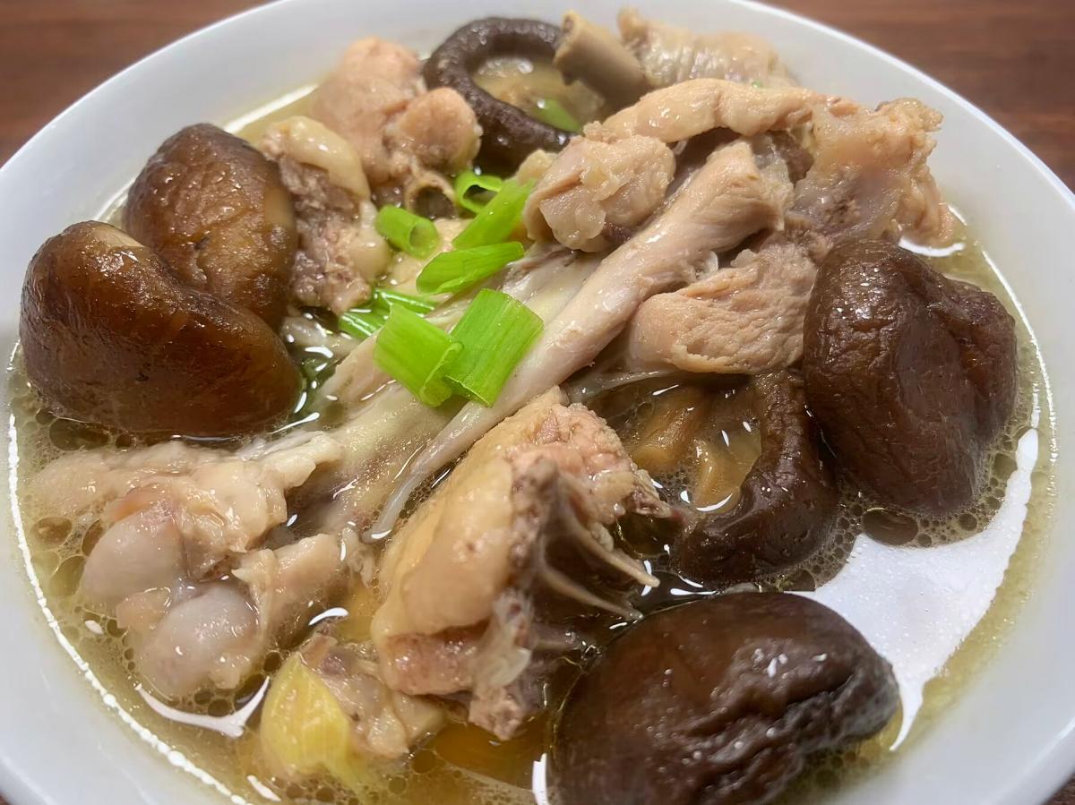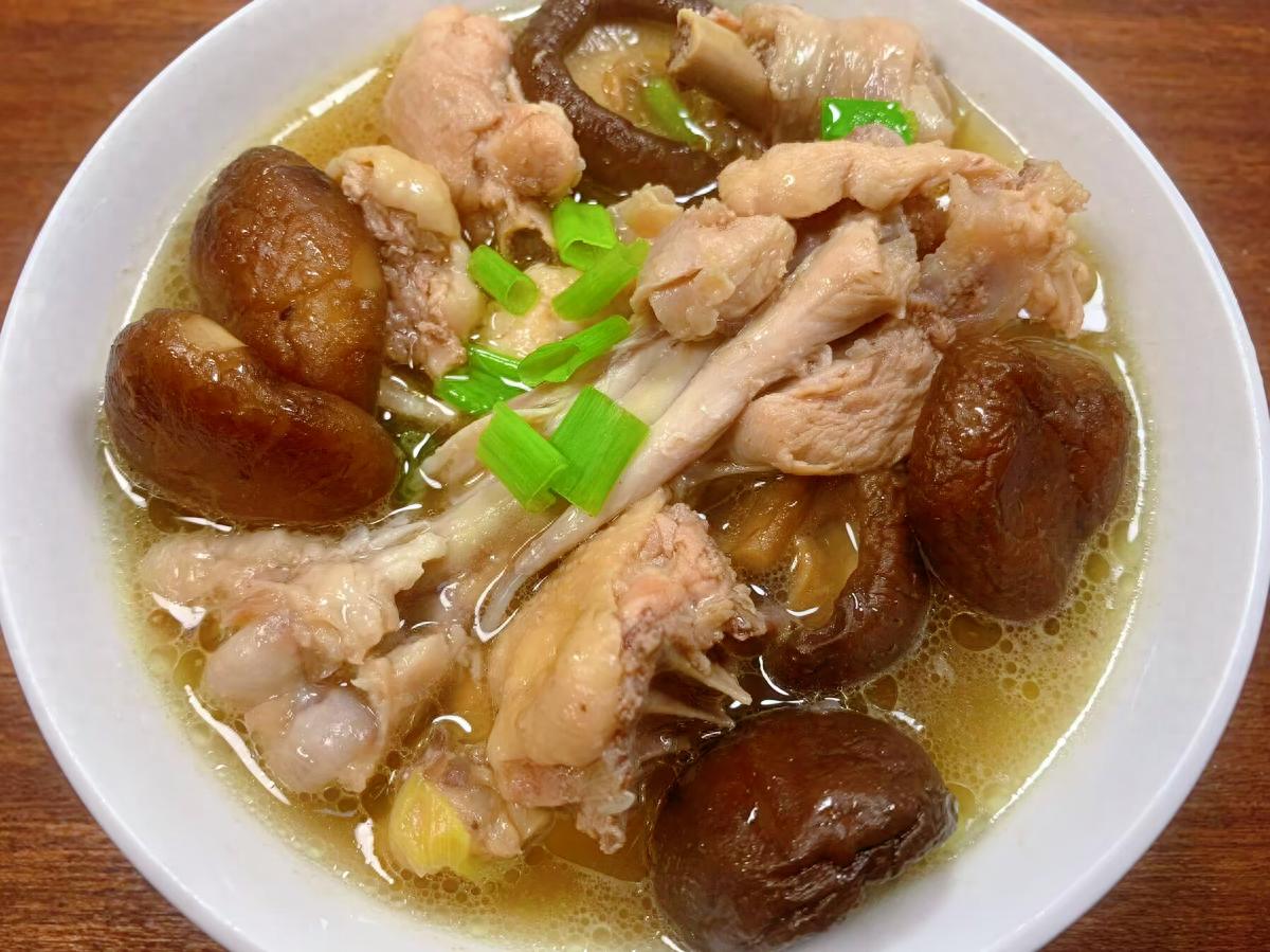 香菇雞肉湯盛入碗中,撒上一些小蔥花點綴,湯汁鮮美好喝,雞肉軟爛入味,全家老少都愛喫,太香了。