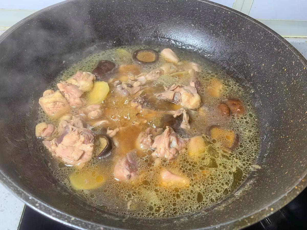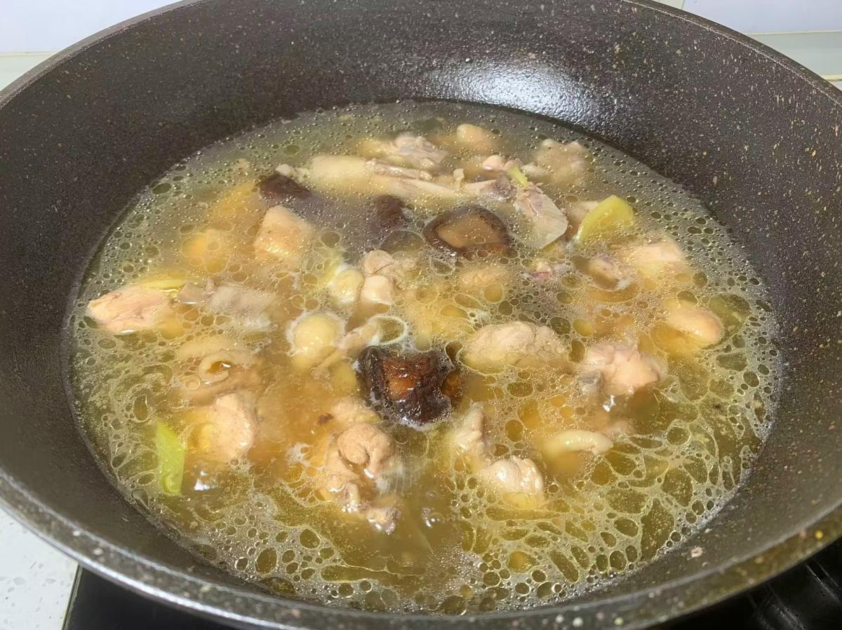 3、往鍋中倒入適量溫水,水量要沒過雞塊,然後加2塊冰糖,放入香菇,大火把湯汁煮沸騰,撒上少許鹽,轉成中火慢燉40分鐘左右。