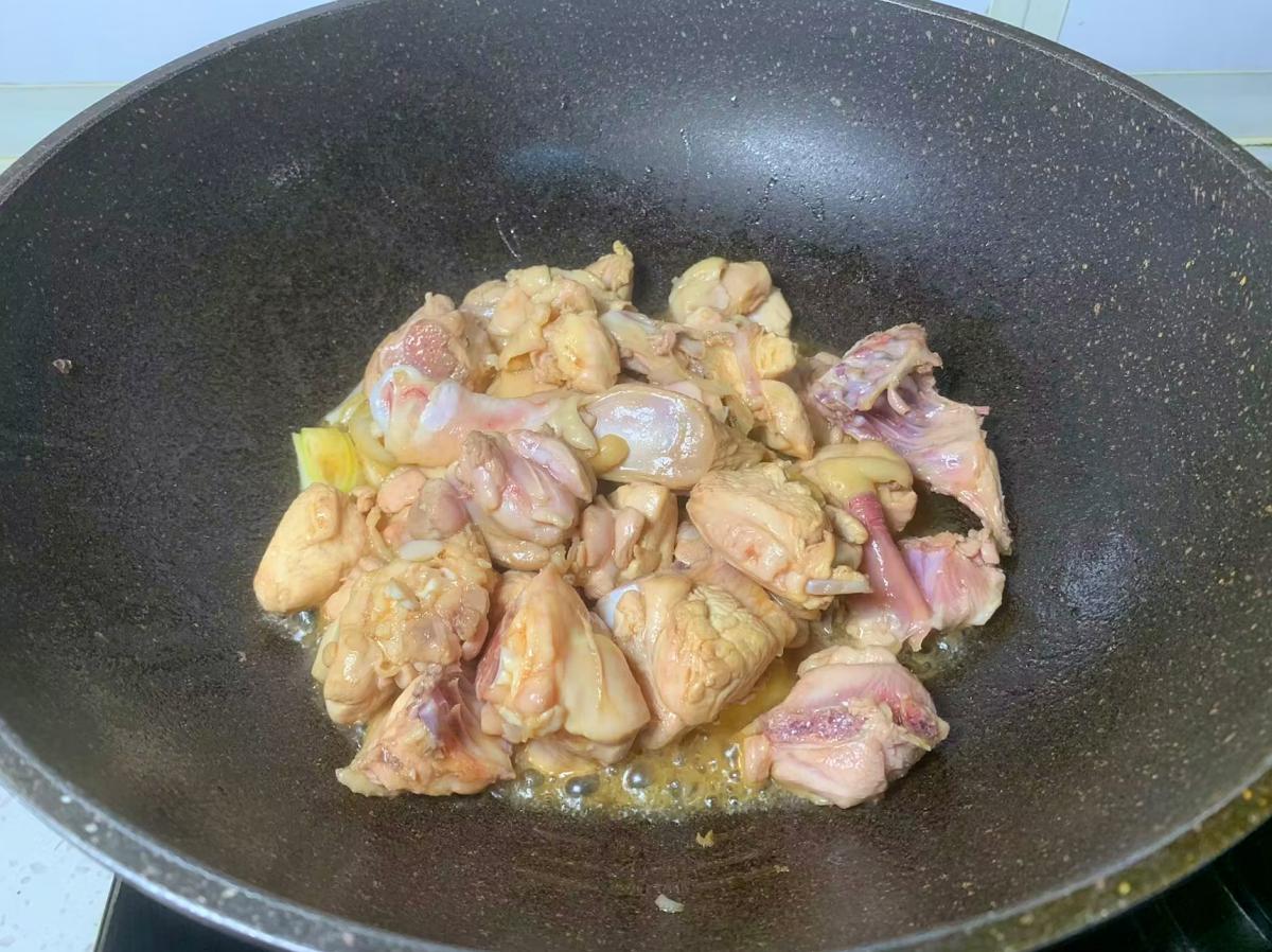 2、起鍋燒油,先倒入瀝水後的雞塊,快速翻炒,炒幹雞肉中的水分,隨後放入蔥姜煸炒出香味,再淋入1小勺料酒去腥,1勺味極鮮提色增香,把雞肉塊炒至變色。