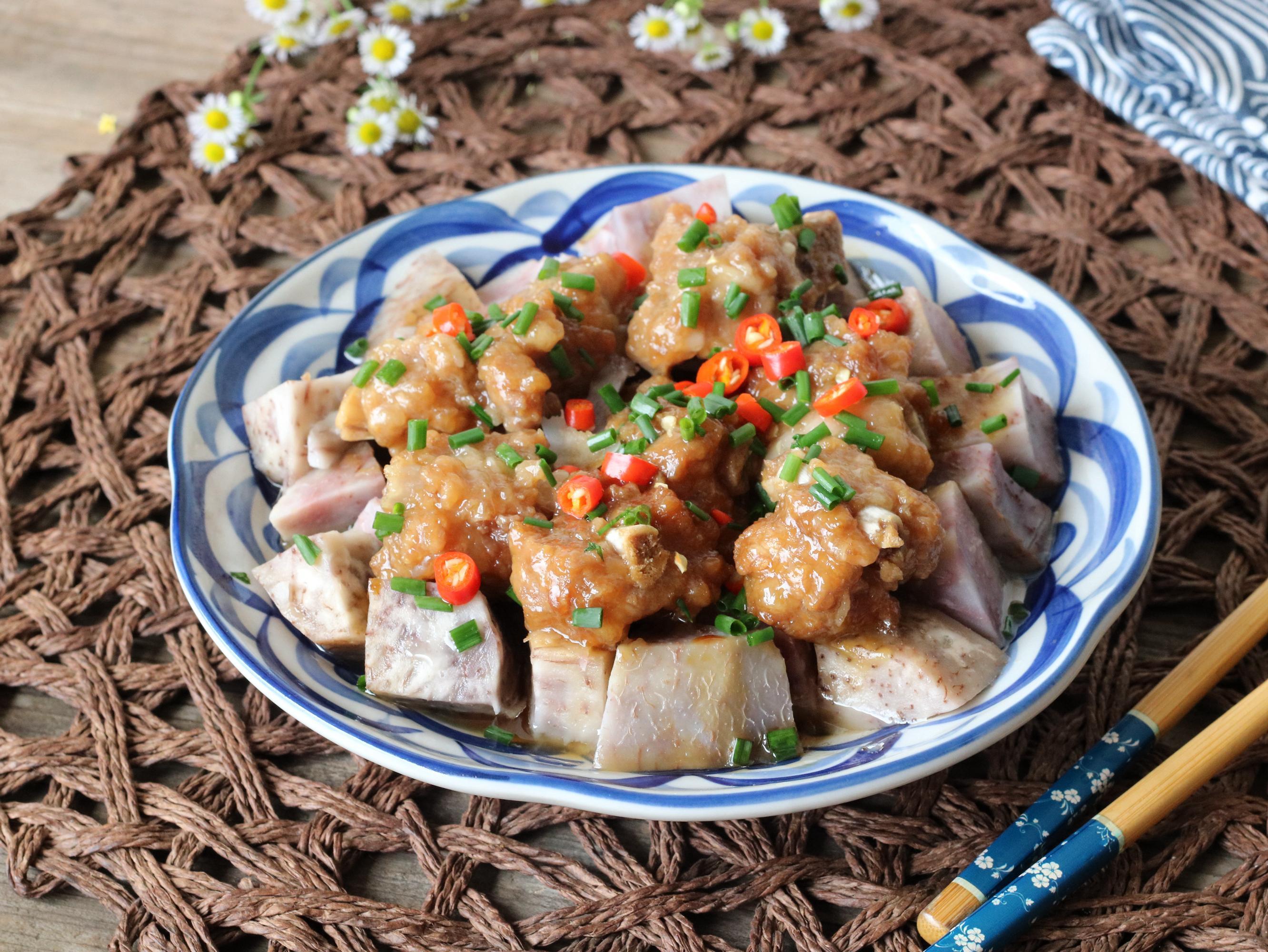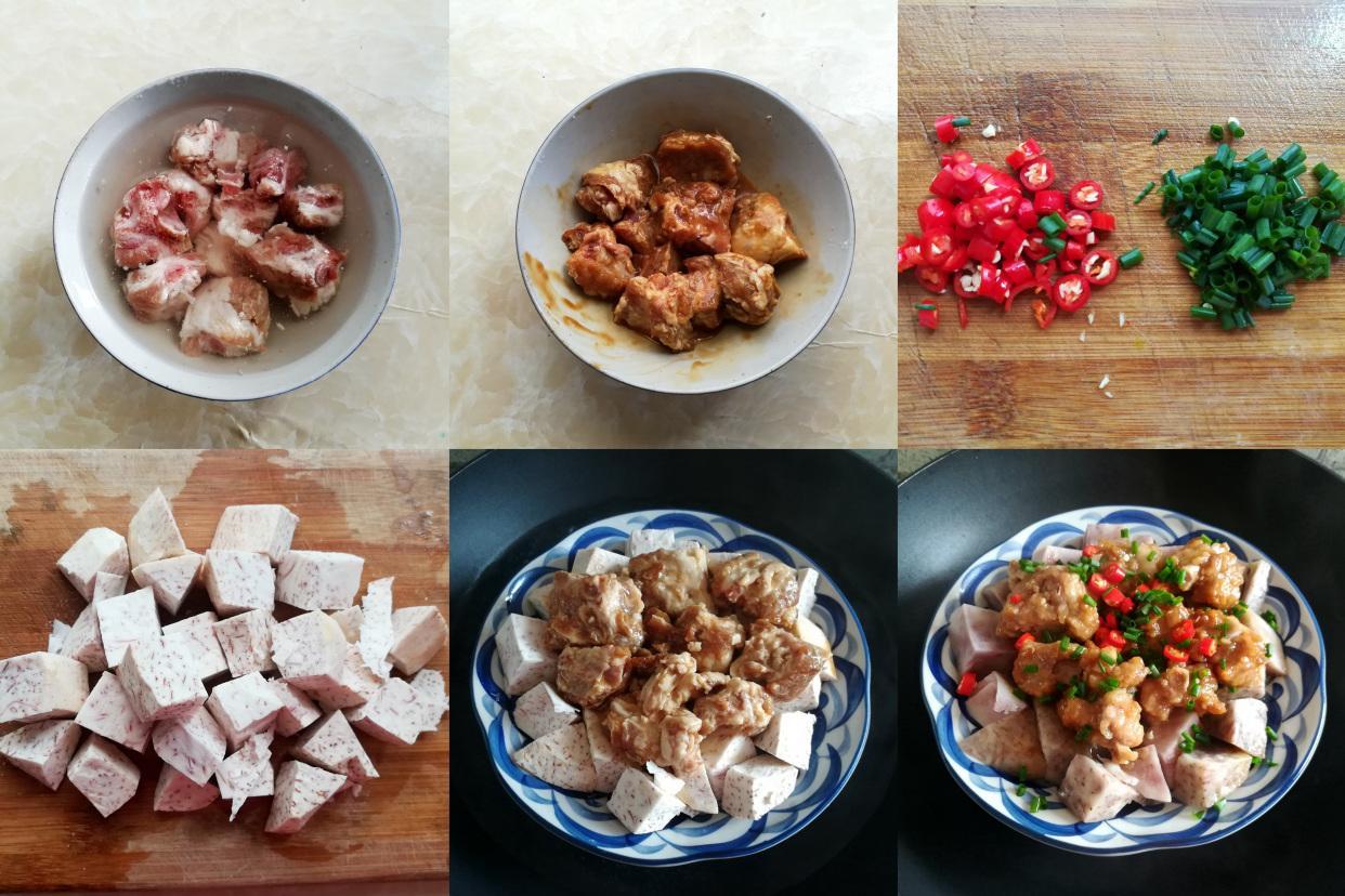 食材:荔浦芋頭 半個,排骨 1根,料酒、生抽、蠔油、玉米澱粉、小米椒、香蔥