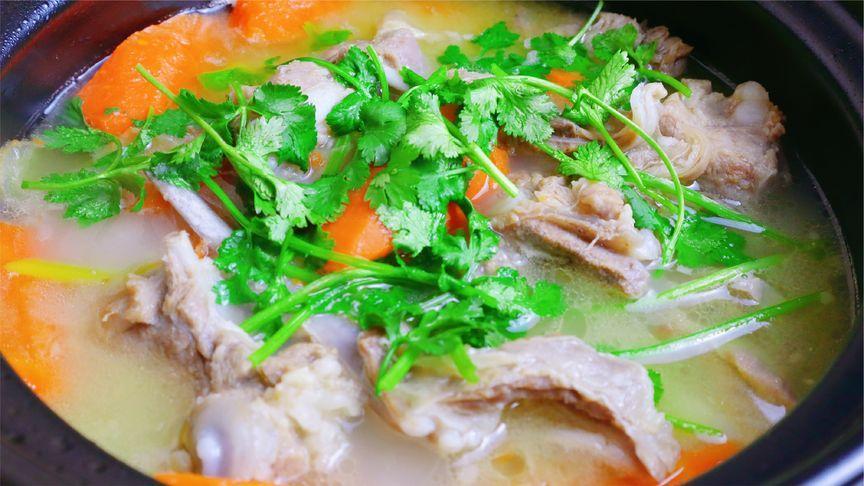 2、油燒熱,再把羊肉炒至表面微焦。再放入蔥姜,再倒入熱水,燉十分鐘左右,接下來準備個砂鍋,然後再把羊肉湯倒進來,中小火煮40分鐘左右,時間到,把胡蘿蔔倒進來。繼續燉15分鐘左右,再放一些鹽調味,最後再放一點香菜,羊肉湯就做好了。