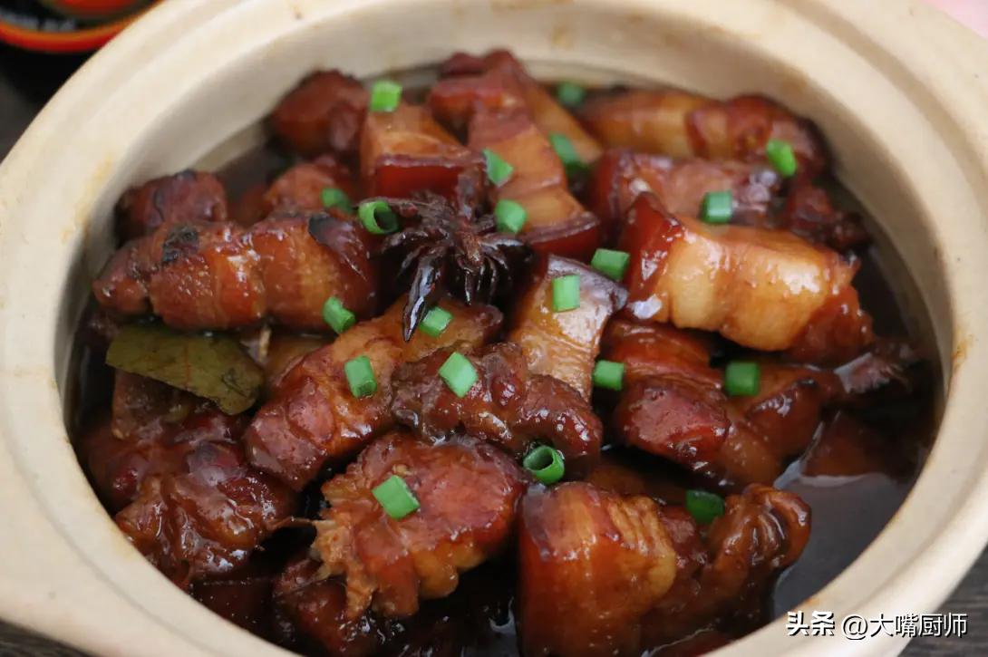 準備五花肉、香蔥、生薑、蒜瓣、八角、香葉、桂皮、冰糖、食鹽、老抽、生抽、料酒、食用油。