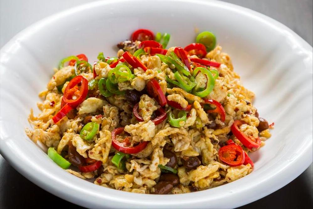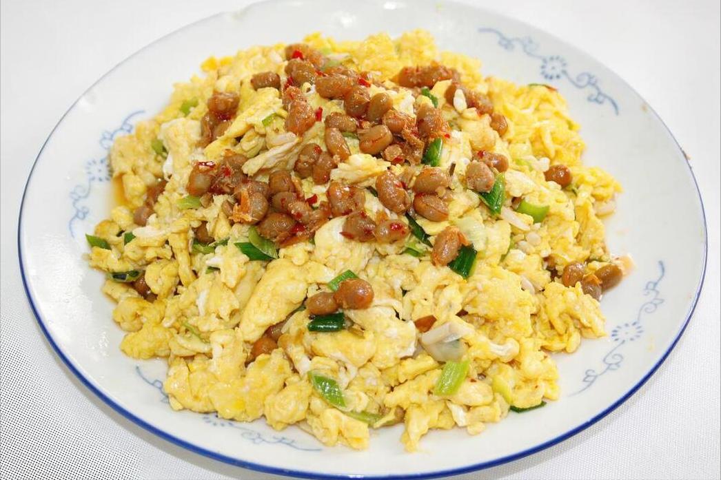 青紅椒、大蒜提前切好,雞蛋打散在碗裏,鍋中倒油,燒熱後下入蛋液翻炒,炒到斷生、炒成小塊以後,把青紅辣椒、蒜末、臘八豆一起倒進去,不停翻炒,接着來點生抽、老抽、鹽、味精調味,炒勻即可出鍋。