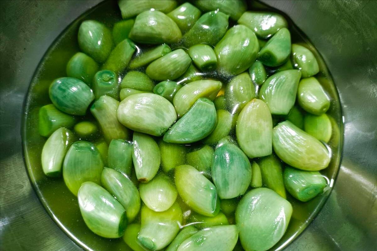 提前準備好罐子,用開水燙好後,把水分晾乾備用。大蒜去皮後,將根部切掉一塊,這樣更好入味。把大蒜倒在瓶子裏,然後往裏面放上幾塊冰糖,不用太多了,接着往其中倒入一瓶米醋,密封起來,白天放在太陽下,晚上放冰箱,這樣醃製1周的時間,就變綠了。