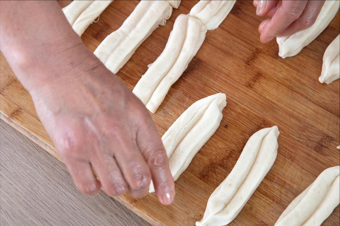 6、擀好後切成條狀,一片還是比較薄的,所以我們要兩片疊在一起,然後拿一根筷子,從中間壓一下,按壓緊實,這樣不容易開裂。弄好之後,就可以往鍋中倒油了,把油燒熱了之後,將油條拿起來,兩隻手拿着抻一下,放入油鍋中炸,炸到金黃後出鍋,就可以開喫啦,非常酥脆。