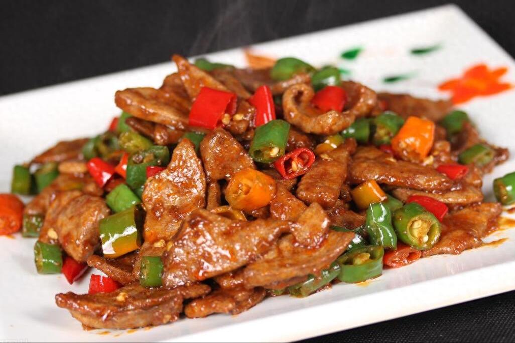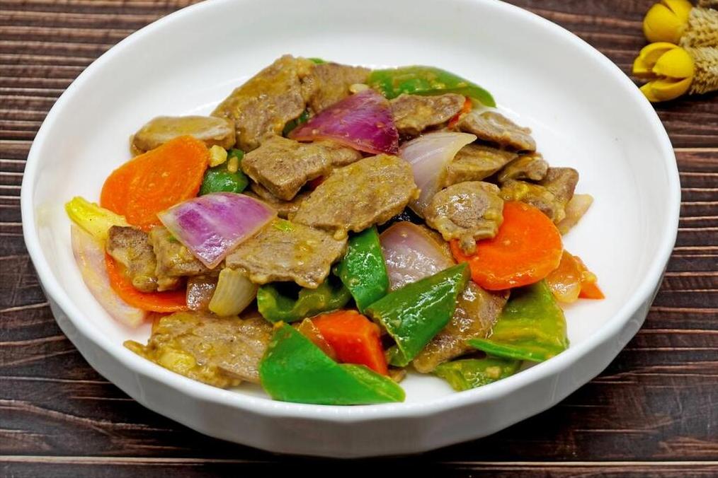 食材:豬肝、青辣椒、紅辣椒、洋蔥、蔥薑蒜、鹽、白胡椒粉、雞精、生抽、料酒、蠔油、玉米澱粉、食用油