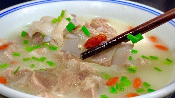 2、把羊肉放到砂鍋裏面,再放幾片大蔥和薑片,一定要用開水,燜個兩個小時,羊肉差不多快要熟了,把山藥放到羊湯裏面,攪拌均勻,燜個20分鐘左右,調個料汁,一小勺食用鹽,雞精,白糖攪拌一下,再撒上一點枸杞,羊肉湯就燉好了。