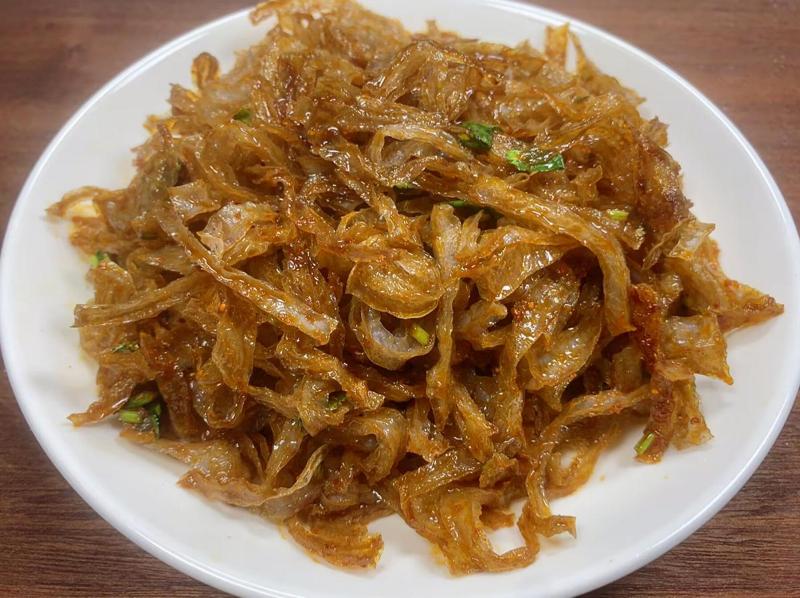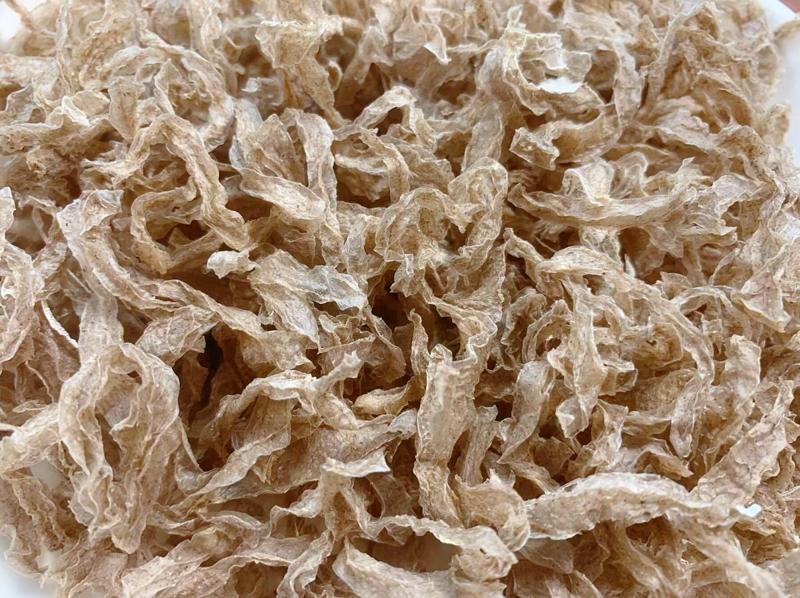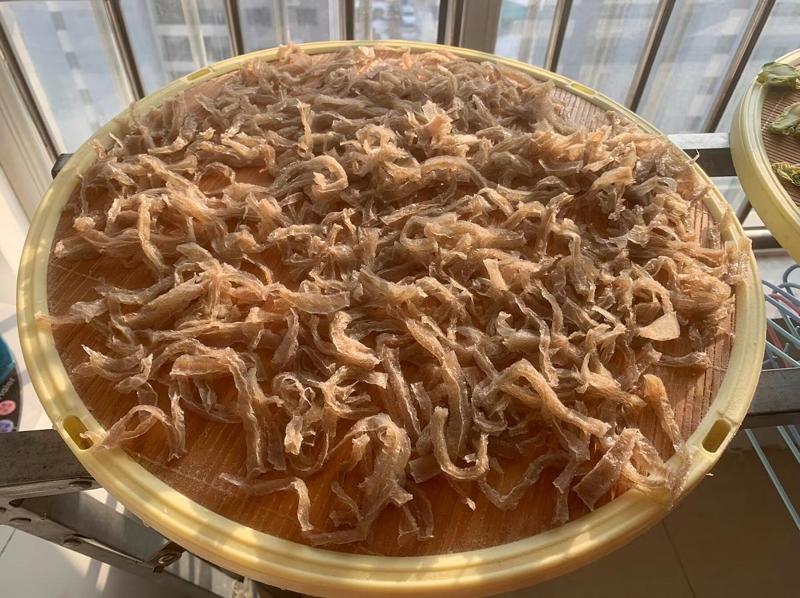 4、下圖是我曬了1天的魔芋豆腐乾,顏色看上去比最初的時候透亮,手摸上去還特爽脆,一定不要着急存放,要繼續晾曬1天就差不多了。