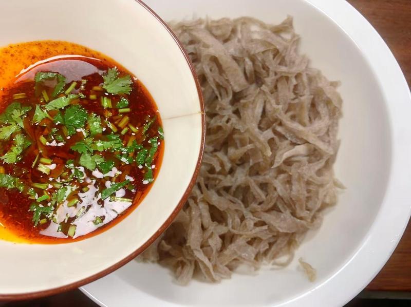 【蒸魔芋幹】 所準備的食材有:魔芋幹、香菜、辣椒油、陳醋、味極鮮、鹽、香油