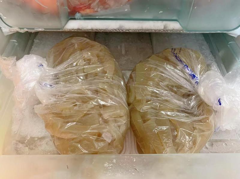 2、接下來準備2個乾淨的食品袋,裝上魔芋條,繫好口,放入冰箱冷凍一個晚上,這期間儘量不要打開冰箱,一定要把它凍緊實。