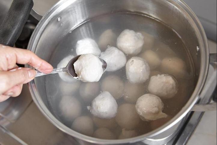 5、準備一鍋清水,先不要開火,把魚肉從虎口處,團成一個個的小魚丸,然後直接下入鍋中。等所有的魚丸都下進去以後,就可以開小火開始煮了,全程用小火,保證水不沸騰,煮到魚丸體積變大,漂浮在水面上就可以了。